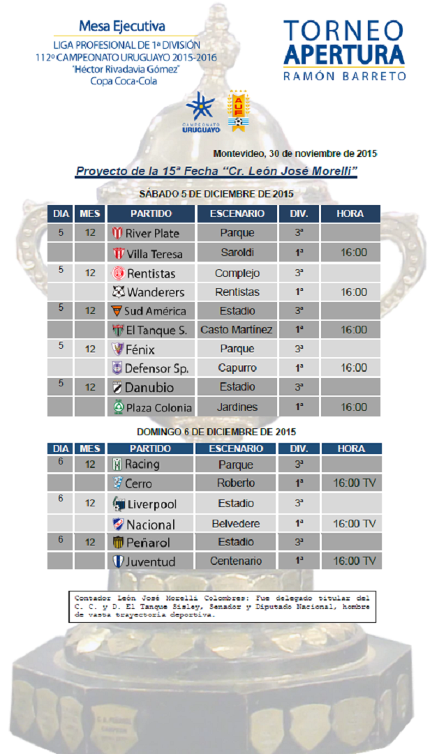 La última fecha del Torneo Apertura será fijada esta noche por la Mesa Ejecutiva de acuerdo al programa establecido el pasado domingo, por lo tanto no se registrarán modificaciones.