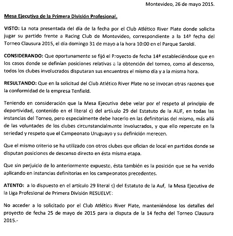 La Resolución de la Mesa  no accediendo al petitorio de River Plate.