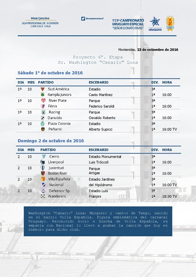 La Mesa Ejecutiva tiene un proyecto para la sexta fecha del Campeonato Uruguayo Especial que se jugará el fin de semana del sábado 1° y el domingo 2 de octubre. El órgano dejó que sea el club Villa Española el que determine a quien homenajear con el nombre de la etapa y fue elegido el de Washington “Canario”Luna.