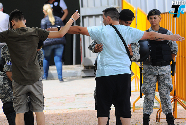 Efectivos de la policía cumplen con el operativo de seguridad en las afueras del Estadio Centenario. Uno por uno realiza el típico cacheo a los espectadores que en formando fila comienzan a ingresar a las distintas tribunas. Ya en las puertas de acceso, componentes de la seguridad privada completan la inspección con los detectores de metales. Tras ser agredidos, los funcionarios de recaudación AUF que cumplían funciones en la tribuna Amsterdam, abandonaron sus puestos de trabajo. Las puertas quedaron cerradas y gente con entrada en mano, esperan para ingresar…
