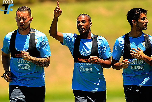 Rodrigo Amaral, Nicolás De La Cruz y Diego Rossi al trote con la Celeste.
