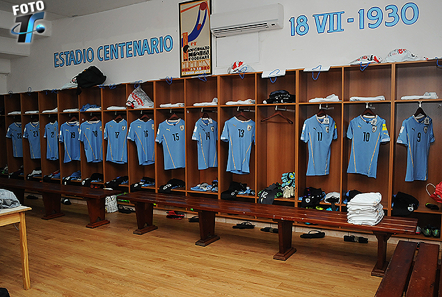 Todo pronto en el vestuario para recibir a los jugadores que parten en minutos del complejo deportivo de la AUF con destino al Estadio Centenario. Las camisetas ya se encuentran prolijamente ubicadas en los respectivos roperos del camarín que se encuentra debajo de la Tribuna América sobre la Amsterdam. El popular “Minguta”, utilero de la selección, alistó la ropa de juego y de calentamiento para los veintitrés integrantes del plantel.