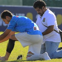 El golero Juan Franchi debió cambiar las medias antes de comenzar el partido por orden el juez.