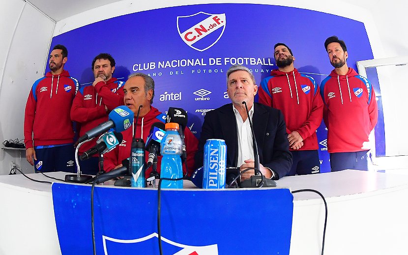 Martín Lasarte, acompañado por el presidente Alejandro Balbi y los componentes del cuerpo técnico, habló en conferencia de prensa.