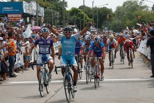 Laureano Rosas celebra al cruzar la línea de llegada en Cno. Maldonado, frente al Club Ciclista Fénix.