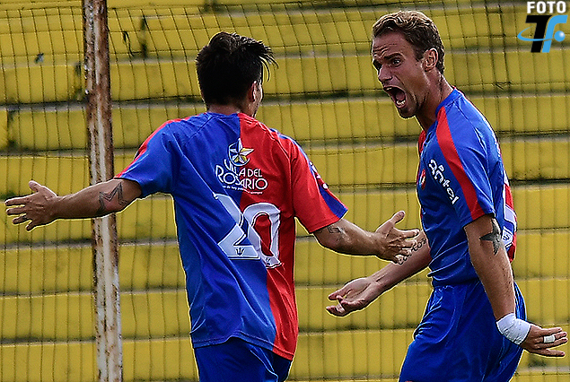 Felipe Laurino en el festejó de gol junto a Facundo Rodríguez (20 de Albion).