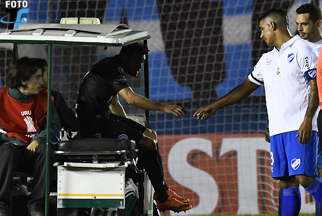 Lautaro Acosta, lesionado deja la cancha en el móvil de auxilio.