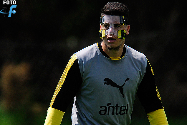 Carlos Rodríguez entrenó con la máscara protectora. El zaguero jugó ante Danubio con la máscara facial de protección por un golpe que sufrió en el partido anterior ante Atenas.