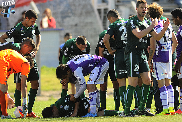 Martín Ligüera muestra su preocupación por el lesionado Alejandro Villoldo; en la jugada fue expulsado el 10 de Fénix