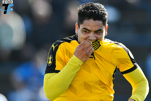 Cristian Rodríguez brazos abiertos vuela en el festejo del tercer gol carbonero.