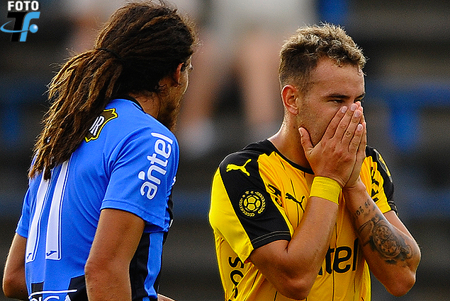 Junior Arias se lamenta tras marrar la opción más clara de gol de Peñarol.