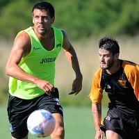 Paulo Pezzolano se escapa a la marca de Fernando Pascual en el amistoso jugado en Lomas de Zamora.