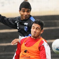 Rodrigo Aguirre supera a Darío Flores en el juego aéreo.