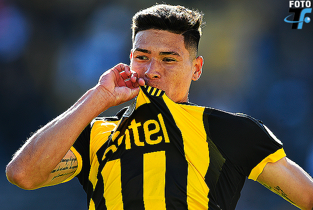 Darwin Núñez festeja su primer gol oficial con la camiseta de Peñarol ante Fénix en el Estadio Campeón del Siglo.