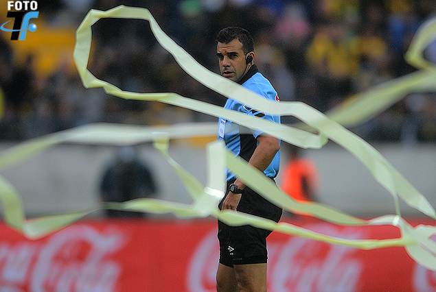 El viento fue protagonista del fútbol del domingo. El juez Cristian Ferreyra .en medio del vuelo de serpentinas