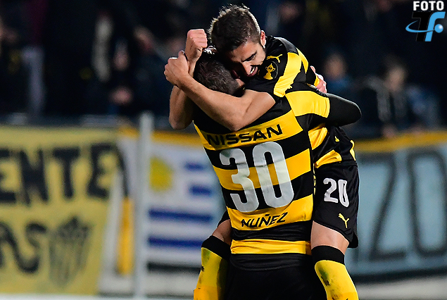 Luis Urruti festeja el gol con Yeferson Quintana en la goleada de Peñarol.