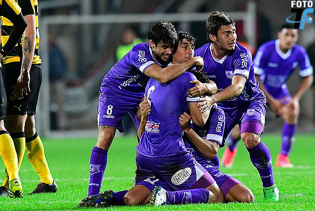 Los jugadores violetas en el festejo de gol de Ayrton Cougo ante Peñarol.