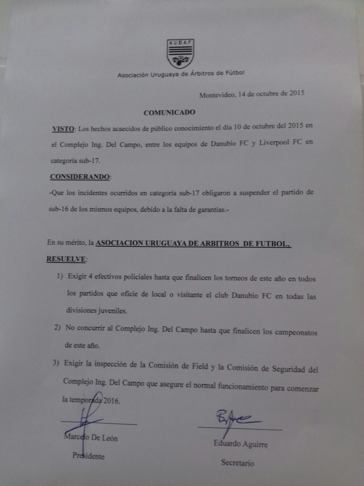 La Comisión Directiva de la Asociación Uruguaya de Árbitros de Fútbol (AUDAF) adoptó determinaciones con respecto a los incidentes registrados en el partido de la categoría Sub 17 entre Danubio y Liverpool jugado en el Complejo Ing. Héctor Del Campo.