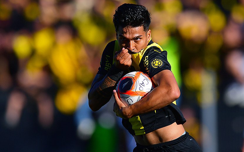 Matías Arezo, el sagrado beso al escudo y la pelota en la mano izquierda, en el festejo del primer gol aurinegro.