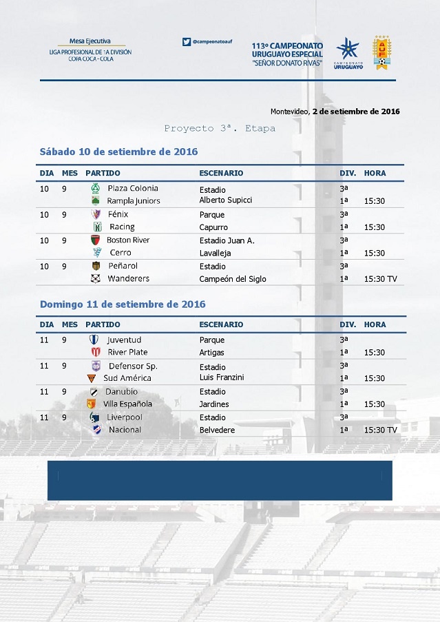La Mesa Ejecutiva tiene un proyecto para la tercera fecha del Campeonato Uruguayo Especial. En el mismo se destaca el horario tempranero para los encuentros de los grandes por diferentes motivos. El sábado 10 Liverpool – Nacional está programado para el Estadio Belvedere y debido a que el escenario carece de red lumínica debe comenzar a la hora 15.30. El domingo 11 Peñarol será local en su Estadio Campeón del Siglo frente a Wanderers y los aurinegros solicitaron jugar a la hora 15.30. Tenfield podrá elegir otros dos partidos para ser televisados en el horario de las 19.00, tanto para sábado como para domingo.