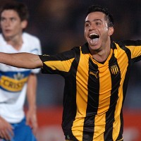 Martinuccio festeja frente a Universidad Católica en el 2011, último triunfo aurinegros ante chilenos. En el 2012 fue empate 1::1 con U. de Chile.