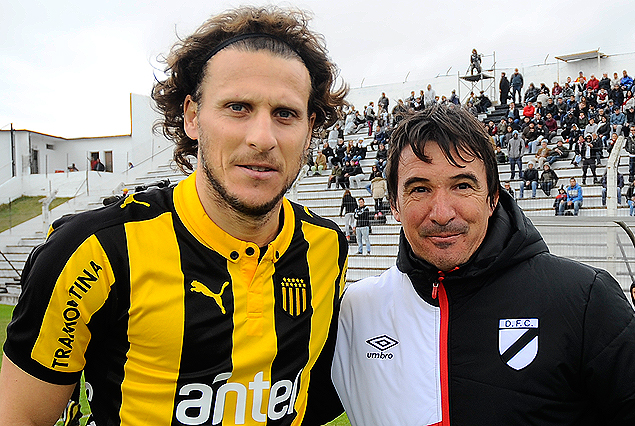 Saludo… Diego Forlán y el profesor Alejandro Valenzuela, intercambiaron saludos en cancha durante los ejercicios precompetitivos. Compartieron selección uruguaya en la Copa América Perú 2004 y las eliminatorias Alemania 2006.