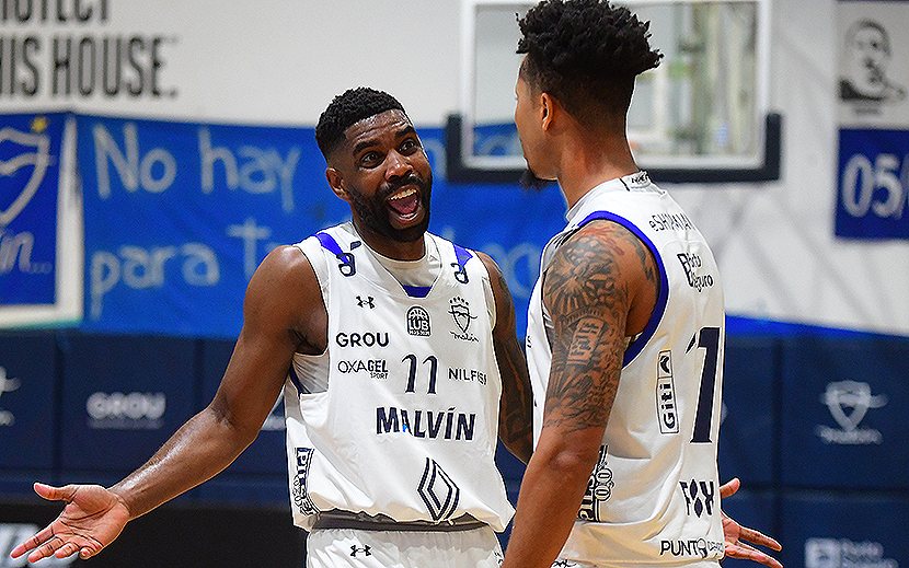Joshua Webster goleador del partido celebra con Darrell Davis el gran triunfo frente a Aguada, las dos nuevas incorporaciones de gran noche en su debut.