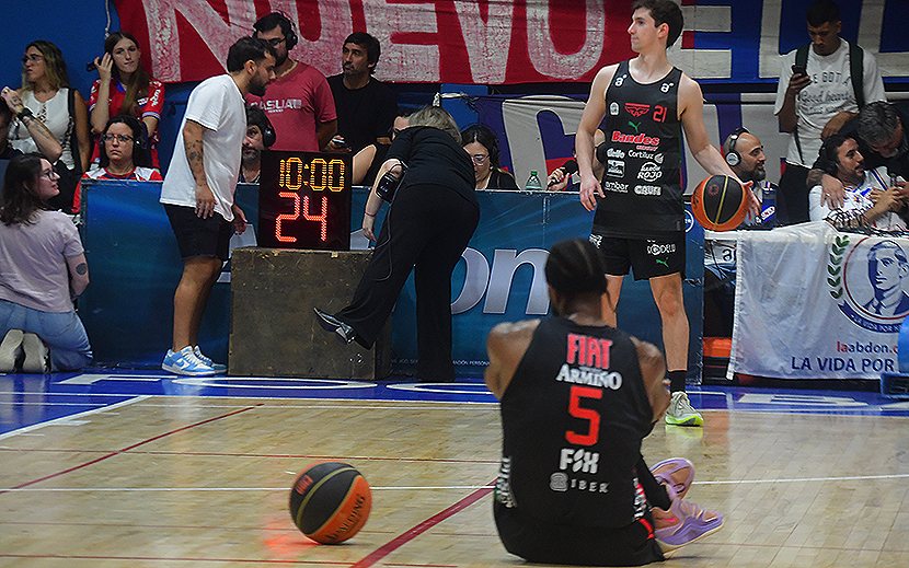 Luciano Parodi espera sentado junto al reloj de 24 segundos colocado a nivel de la cancha, mientras el partido se encuentra demorado por fallas técnicas.