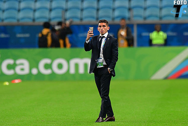 Lucas Torreira celular en mano en la cancha del estadio.