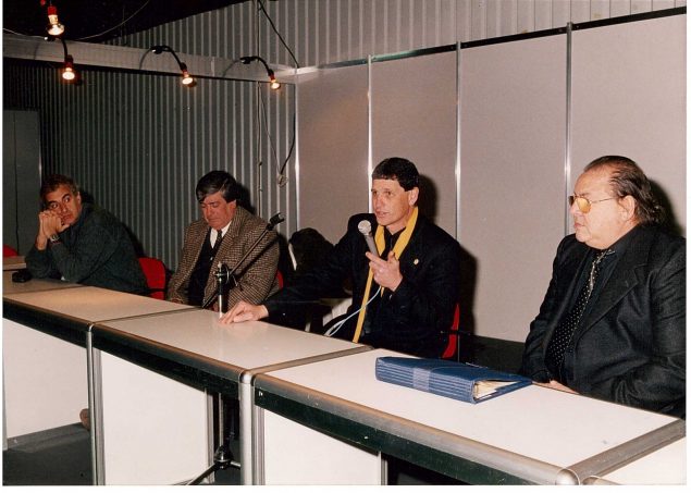 Luis con la gremial.Exposicion de AUDEF en LATU año 2000. Jorge Fossati, Juan Martin Mugica, Ariel Longo y Luis Garisto.