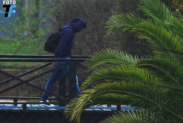 Luis Suárez de retorno en el Complejo Celeste… Llegó pasadas las 15:00 horas piloteando su camioneta negra, acompañado por su señora esposa. Descendió encapuchado para protegerse de la intensa lluvia y a marcha rauda ingresó al local de concentración. Se dirigió a la zona de vestuario donde fue recibido con saludos y sonrisas por sus compañeros.