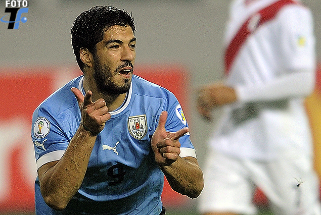 Luis Suárez se llena la boca de gol en la celebración del doblete en Lima del 06/09/2013.