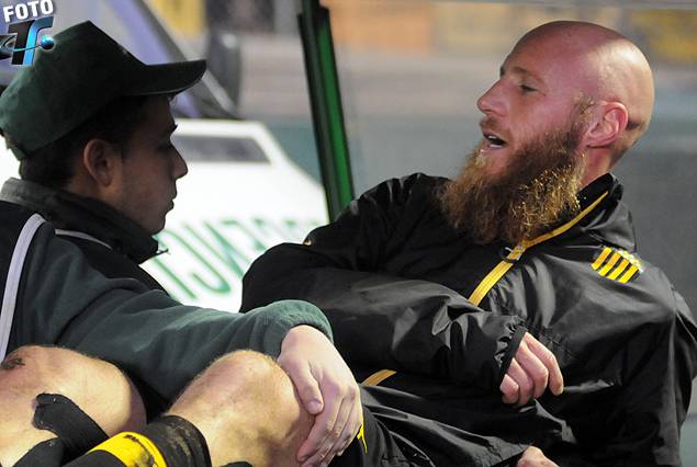OPERADO: Marcel Novick cayó por la lesión y en el vestuario se precisó el diagnóstico: rotura del tendón de Aquiles. El “Vikingo” volvió al banco, abrigado y con una férula. El lunes erá operado el lunes. Tendrá para seis meses de recuperación.