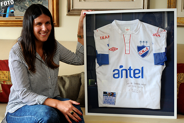 María Laura Muxi muestra con orgullo la camiseta de Nacional  que le regaló Carlos De Pena, su primo, a horas de asumir el gran reto en la dirigencia tricolor.