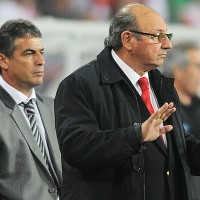 Sergio Markarian al frente, Pablo Bengoechea al fondo. Se van de la selección de Perú.