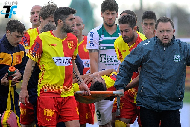 Con fractura de clavícula salió el lateral de Villa Española Maximiliano Gómez del campo de juego, cargado por sus compañeros de equipo y también del equipo de Plaza, cuando transcurrían 14′ del segundo tiempo.