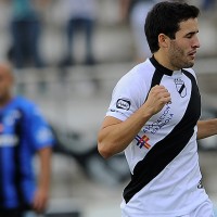 Camilo Mayada celebra el primer gol franjeado, Raúl Ferro se lamenta al fondo