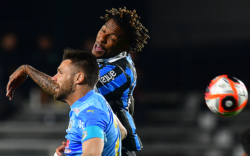 Abel Hernández, se eleva de cabeza ante la férrea marca de Gary Kagelmacher.