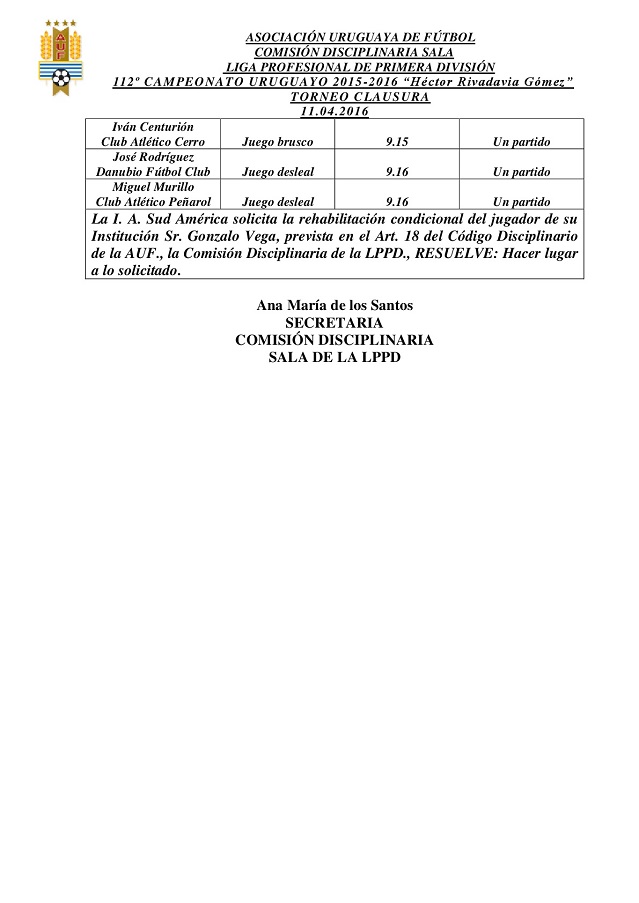 Los fallos de la octava fecha fueron dictados por la Comisión Disciplinaria y están en el boletín correspondiente, al igual que la rehabilitación condicional para Gonzalo Vega, que fue pedida por Sud América y concedida por el órgano jurisdicional.