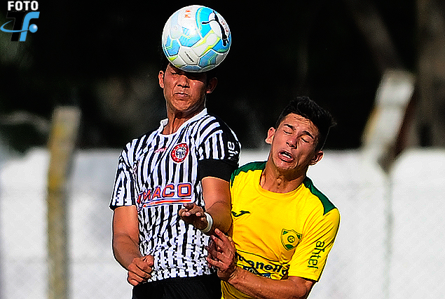 Nicolás Pandiani rechaza de cabeza superando el intento ofensivo de Maxi Silvera.
