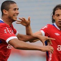 Diego Arismendi en la carrera del festejo del segundo gol tricolor, Richard Porta se acerca para saludarlo.