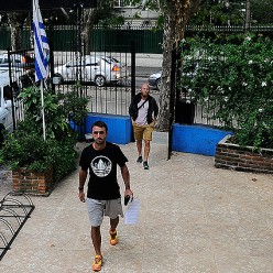 Emiliano Albín y Marcel Novick, representantes del plantel de Peñarol, ingresando a la sede social de la Mutual.