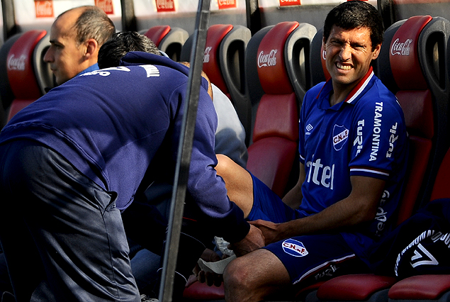Ignacio González, visiblemente dolorido, es asistido por la sanidad en el banco de suplentes. Sufrió lesión muscular.