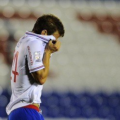 Iván Alonso es la imagen de la derrota. El delantero se tapa la cara con su camiseta en clara señal de desazón y frustración.