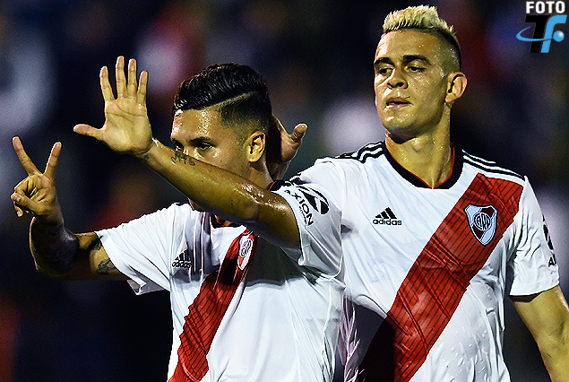 El festejo de los colombianos de River; Juan Fernando Quintero simboliza el siete, número de la camiseta de Rodrigo Mora, en la imagen junto a Rafael Santos Borré.