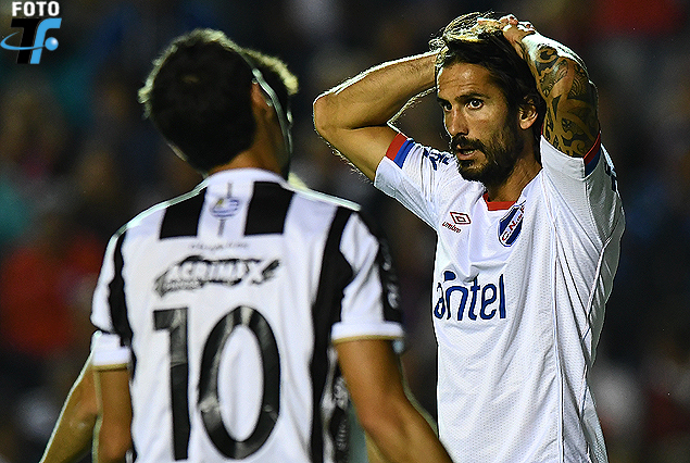 Ignacio González de espalda observa como Marcos Angeleri se toma la cabeza. Nacional cayó sin levante.