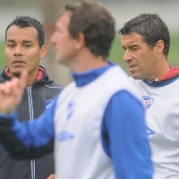 Arruabarrena ordena el trabajo. Ismael Benegas titular y Andrés Scotti con el chaleco blanco con los suplentes.