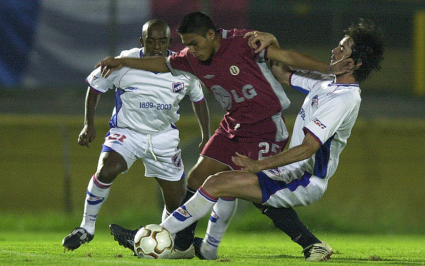 Oscar Javier Morales y Marco Vanzini, le cortan el paso al delantero peruano en el triunfo de Nacional, 2:0 sobre Universitario por la Copa Libertadores de 2003.