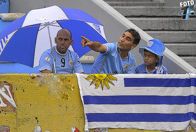 El día lluvioso no amilana el ánimo de los hinchas uruguayos que desde muy temprano llegaron al Estadio Centenario para alentar a la selección. Miles de compatriotas ya se encuentran instalados en las distintas tribunas. Unos protegidos por paraguas, otros con pilotos, pero la mayoría simplemente luciendo la histórica camiseta color cielo.