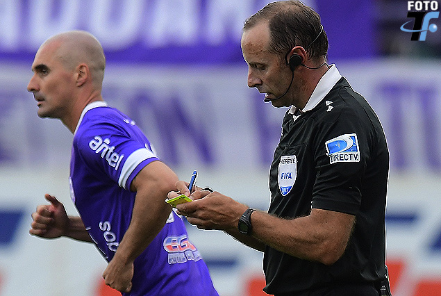Nicolás Correa corre, mientras Daniel Fedorczuk anota la tarjeta amarilla que le mostró al zaguero.